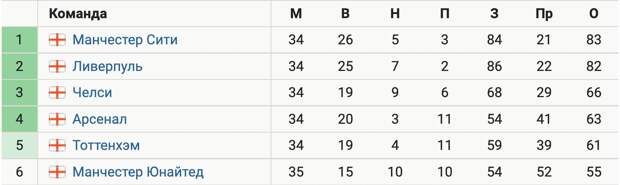 В 34-м туре АПЛ занимающий четвертое место «Арсенал» (63 очка) обыграл «Вест Хэм» (2:1) и опережает «МЮ» (55 очков), который идет шестым в таблице, на восемь баллов.
