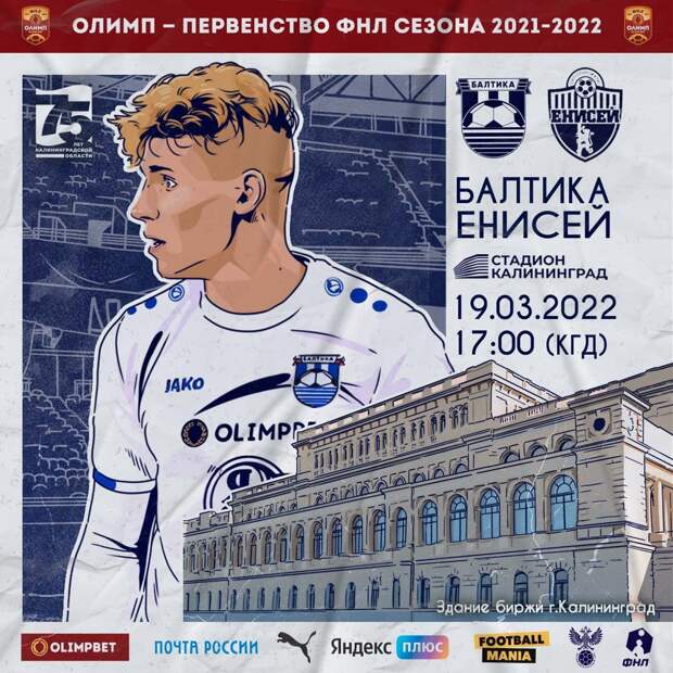 В рамках 28 тура Олимп-ФНЛ «Балтика» примет «Енисей», матч состоится 19 марта в 17:00 по местному времени на стадионе «Калининград».