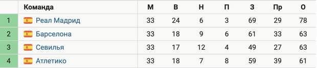У «Севильи» столько же очков, сколько у «Барсы», однако команда тренера Хулена Лопетеги не обойдет «Реал», так как при равенстве очков уступает по результатам личных встреч.