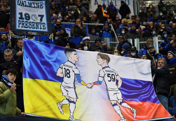 Болельщики клуба из Бергамо перед матчем с «Байером» в Лиге Европы (2:1, перерыв) вывесили баннер, на котором футболисты пожимают друг другу руки на фоне российского и украинского флагов.