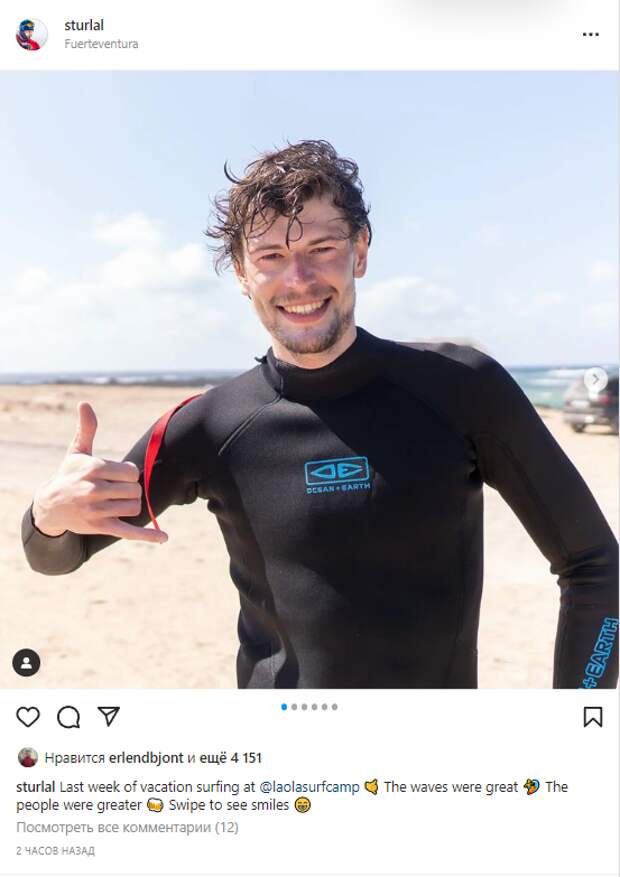 «Серфинг в последнюю неделю отпуска. Волны были отличными. А люди – еще лучше», – написал Лагрейд.